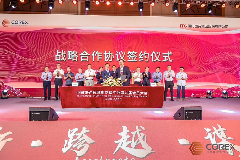 2023年6月15日,北京鐵礦石交易中心(簡稱“北鐵中心”)與廈門國貿(mào)集團(tuán)股份有限公司(簡稱“國貿(mào)股份”)舉辦戰(zhàn)略合作協(xié)議簽約儀式,公司總裁游松及廈門國貿(mào)礦業(yè)有限公司總經(jīng)理李鵬代表雙方簽署協(xié)議,中鋼協(xié)總經(jīng)濟(jì)師王穎生、五礦商會(huì)副會(huì)長錢景汾、中國礦產(chǎn)資源集團(tuán)鐵礦事業(yè)部資源平衡總監(jiān)劉政群等領(lǐng)導(dǎo)共同見證簽約。
