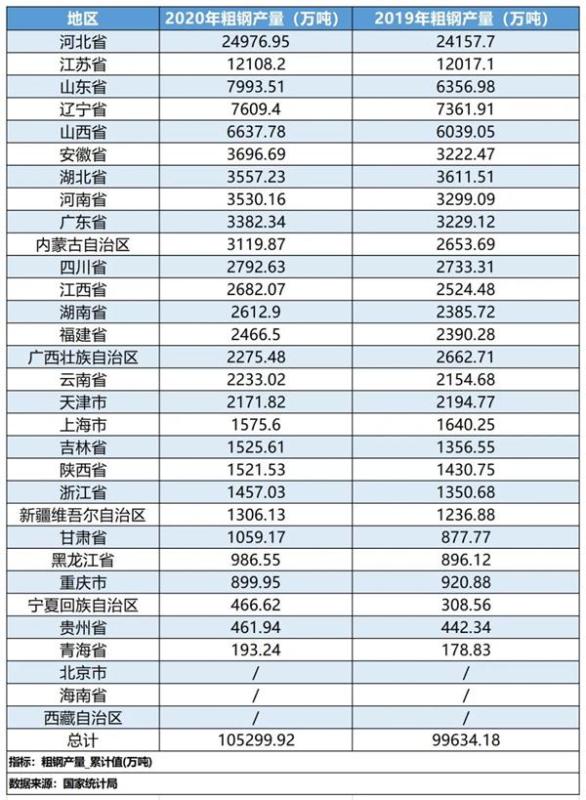 近日,國家統(tǒng)計局公布了2020年31省市自治區(qū)粗鋼產(chǎn)量數(shù)據(jù)。數(shù)據(jù)顯示,2020年河北省粗鋼產(chǎn)量24976.95萬噸,位居第一。