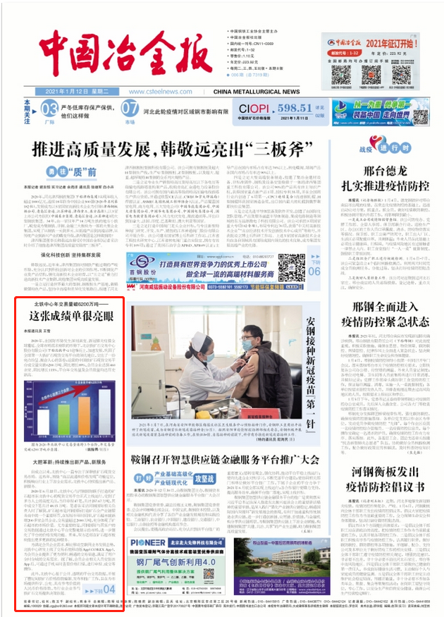 編者按:1月12日,《中國冶金報(bào)》頭版以《北鐵中心年交易量破6200萬噸——這張成績單很亮眼》為題,重點(diǎn)報(bào)道了我公司圍繞 “商品流通和價(jià)格發(fā)現(xiàn)”功能定位,積極響應(yīng)行業(yè)上下游企業(yè)需求,憑借優(yōu)質(zhì)高效服務(wù)贏得了行業(yè)企業(yè)的高度認(rèn)可,年成交量連跨三個(gè)臺階的突出成績。現(xiàn)將報(bào)道全文轉(zhuǎn)載如下: