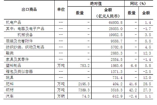 四、機電產品、傳統(tǒng)勞動密集型產品出口增長。前10個月,我國機電產品出口6.49萬億元,增長1.4%,占出口總值的55.5%。其中,電器及電子產品出口2.8萬億元,下降1.7%;機械設備2萬億元,增長3.5%。同期,服裝出口9558.7億元,增長5.5%;紡織品5702.8億元,增長4.5%;鞋類2883.3億元,增長12.3%;家具2554.5億元,下降1.4%;塑料制品1863.6億元,增長5.8%;箱包1371.3億元,下降2.5%;玩具731.4億元,增長12%;上述7大類勞動密集型產品合計出口2.47萬億元,增長5%,占出口總值的21.1%。此外,肥料出口2195.3萬噸,增加41.6%;鋼材7389.3萬噸,增加42.2%;汽車74.3萬輛,減少2.4%(表1)。