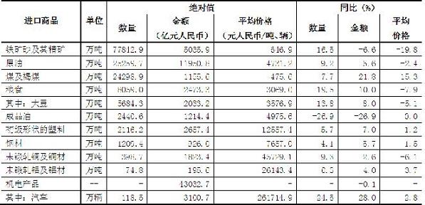 此外,進口煤2.43億噸,減少7.7%,進口均價為每噸475.6元,下跌15.3%;成品油2440.6萬噸,減少26.9%,進口均價為每噸4975.6元,與去年同期基本持平;未鍛軋鋁及鋁材74.8萬噸,減少0.3%,進口均價為每噸2.61萬元,下跌3.7%。機電產品進口4.3萬億元,下降0.1%;其中汽車118.5萬輛,增加24.5%(表2)。