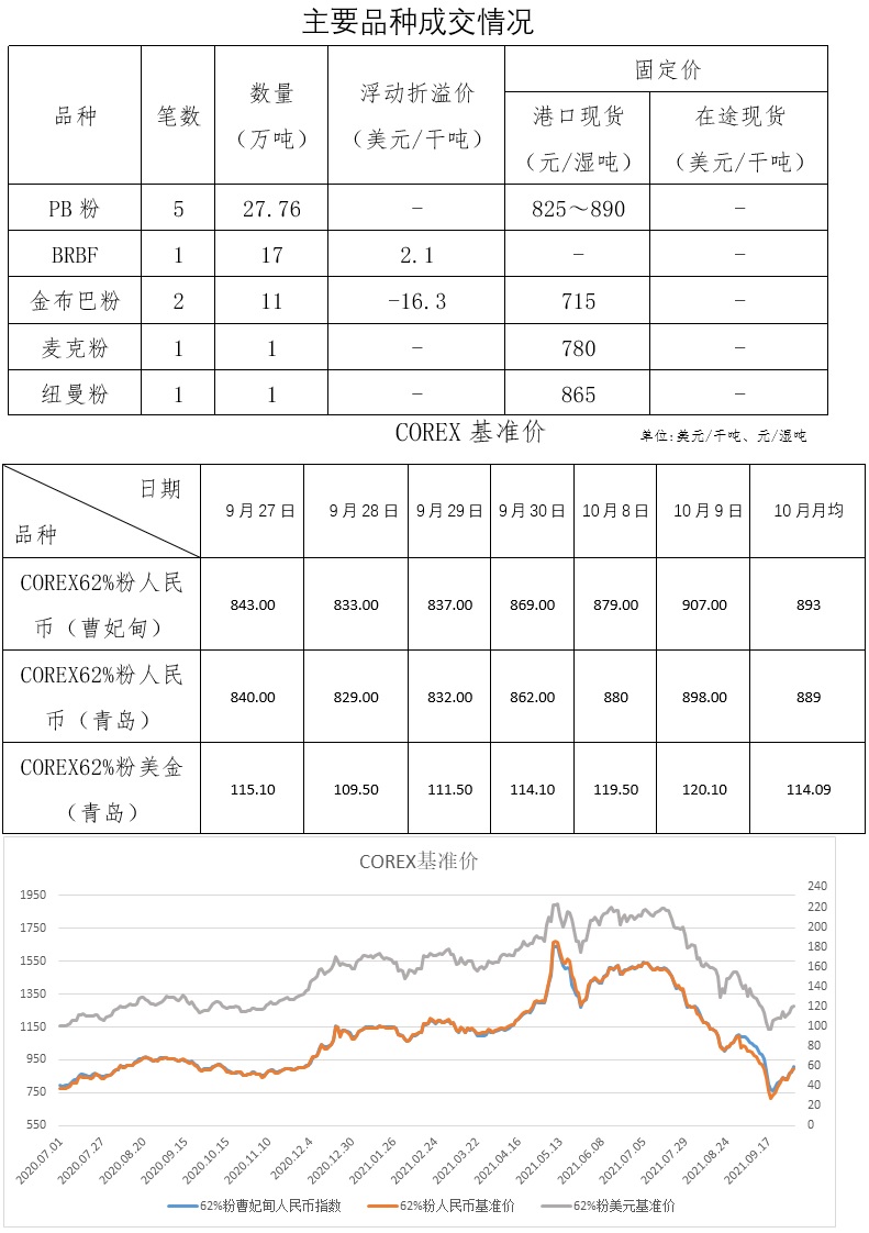 9月27日-10月9日成交17筆共65.28萬噸,其中在途2筆26萬噸,港口15筆39.28萬噸。