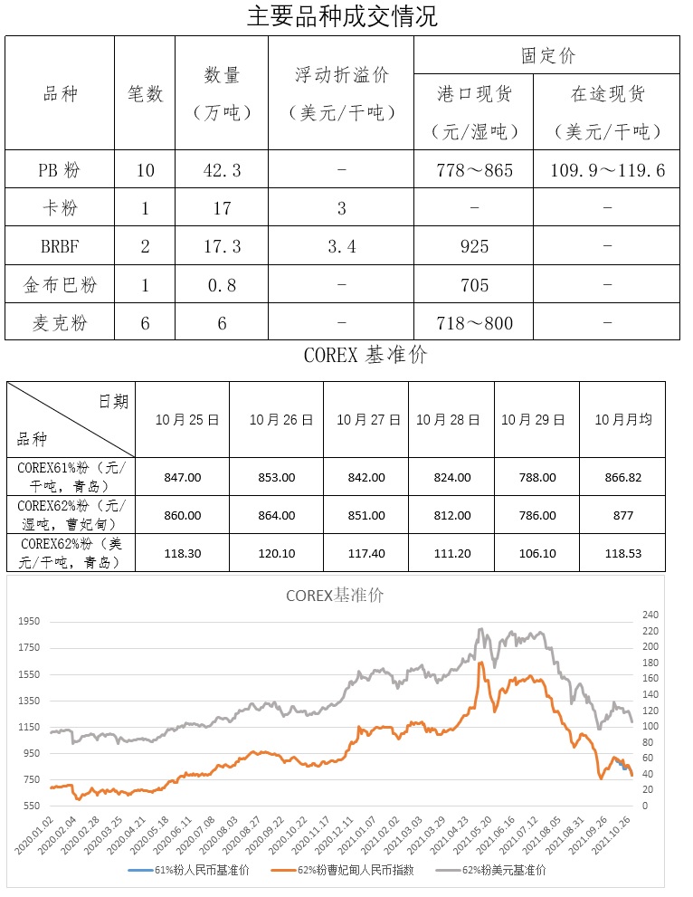 10月25日-10月29日成交30筆共100.6萬噸,其中在途5筆76萬噸,港口25筆24.6萬噸。