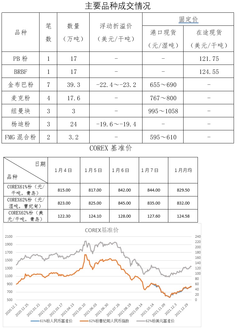 1月3日-1月7日成交38筆共146.92萬(wàn)噸,其中在途9筆108萬(wàn)噸,港口29筆38.92萬(wàn)噸。