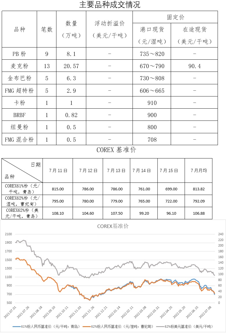 7月11日-7月15日成交51筆共53.09萬(wàn)噸,其中在途1筆9萬(wàn)噸,港口50筆44.09萬(wàn)噸。