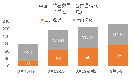 9月5日~9月9日成交108筆共227.67萬噸,其中在途9筆共116萬噸,港口99筆共111.67萬噸。主要成交品種包括:PB粉25筆共58.55萬噸,BRBF 4筆共3.5萬噸,卡拉加斯粉2筆共38.5萬噸,麥克粉8筆共17.7萬噸,金布巴混合粉11筆20.5萬噸,F(xiàn)MG超特粉13筆共17.66萬噸,F(xiàn)MG混合粉8筆共8.61萬噸。