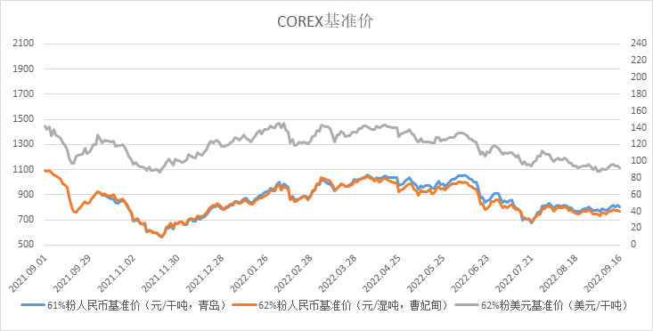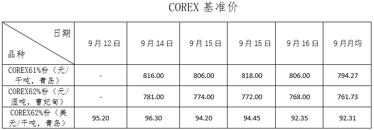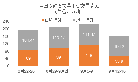 9月12日~9月16日成交103筆共160萬(wàn)噸,其中在途5筆共53.8萬(wàn)噸,港口98筆共106.2萬(wàn)噸。主要成交品種包括:PB粉24筆共28.14萬(wàn)噸,F(xiàn)MG超特粉15筆共20.81萬(wàn)噸,F(xiàn)MG混合粉13筆共28.77萬(wàn)噸,金布巴混合粉13筆共10.1萬(wàn)噸,麥克粉5筆共4.5萬(wàn)噸,BRBF 5筆共3.96萬(wàn)噸,卡拉加斯粉1筆共9萬(wàn)噸。