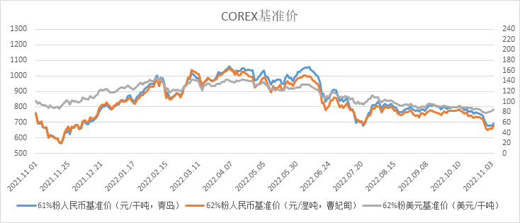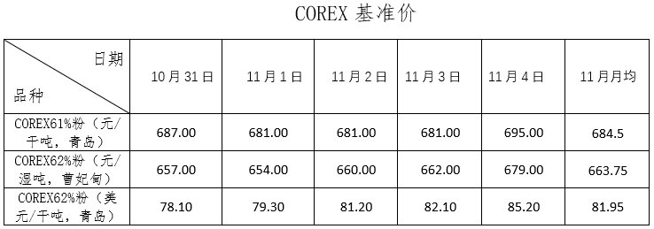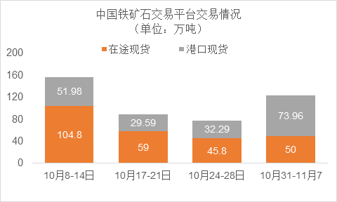 10月31日~11月4日成交83筆共123.96萬噸,其中在途4筆共50萬噸,港口79筆共73.96萬噸。主要成交品種包括:金布巴混合粉11筆共10.67萬噸,PB粉18筆共51.7萬噸,紐曼塊2筆共16萬噸,F(xiàn)MG混合粉5筆共3.35萬噸,麥克粉3筆共3萬噸,F(xiàn)MG超特粉5筆共3.2萬噸,BRBF 3筆共3.2萬噸,卡拉加斯粉3筆共1.7萬噸。