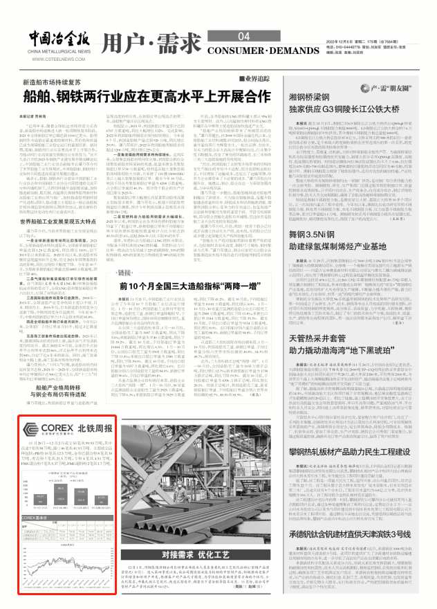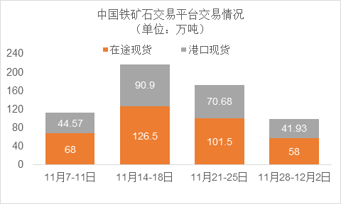 11月28日~12月2日成交53筆共99.93萬噸,其中在途7筆共58萬噸,港口46筆共41.93萬噸。主要成交品種包括:PB粉10筆共12.5萬噸,金布巴混合粉8筆共30萬噸,麥克粉7筆共21.5萬噸,卡粉4筆共4.51萬噸, FMG混合粉7筆共5.37萬噸,F(xiàn)MG超特粉2筆共1.7萬噸。