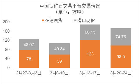 3月20日~3月24日成交79筆共173.26萬噸,其中在途9筆共98.5萬噸,港口70筆共74.76萬噸。主要成交品種包括:PB粉20筆共63.7萬噸,金布巴混合粉5筆共5萬噸,麥克粉2筆共2.2萬噸,揚(yáng)迪粉3筆共12萬噸,卡拉加斯粉9筆17.8萬噸,F(xiàn)MG混合粉5筆共4萬噸。