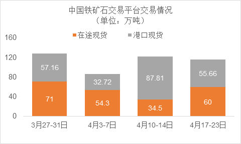 4月17日~4月23日成交63筆共115.66萬噸,其中在途5筆共60萬噸,港口58筆共55.66萬噸。主要成交品種包括:PB粉11筆共28.4萬噸,金布巴混合粉5筆共29萬噸,麥克粉2筆共7.5萬噸,紐曼塊1筆共8萬噸,卡拉加斯粉3筆6.57萬噸,F(xiàn)MG混合粉4筆共4萬噸。