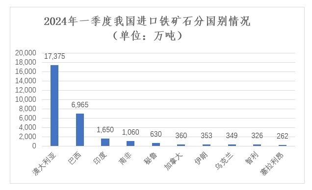 2024年一季度我國(guó)共進(jìn)口鐵礦石為31017萬噸,同比增長(zhǎng)5.6%;進(jìn)口額為401.4億美元,同比增長(zhǎng)16.7%;進(jìn)口均價(jià)為130美元/噸,同比上漲10.6%。