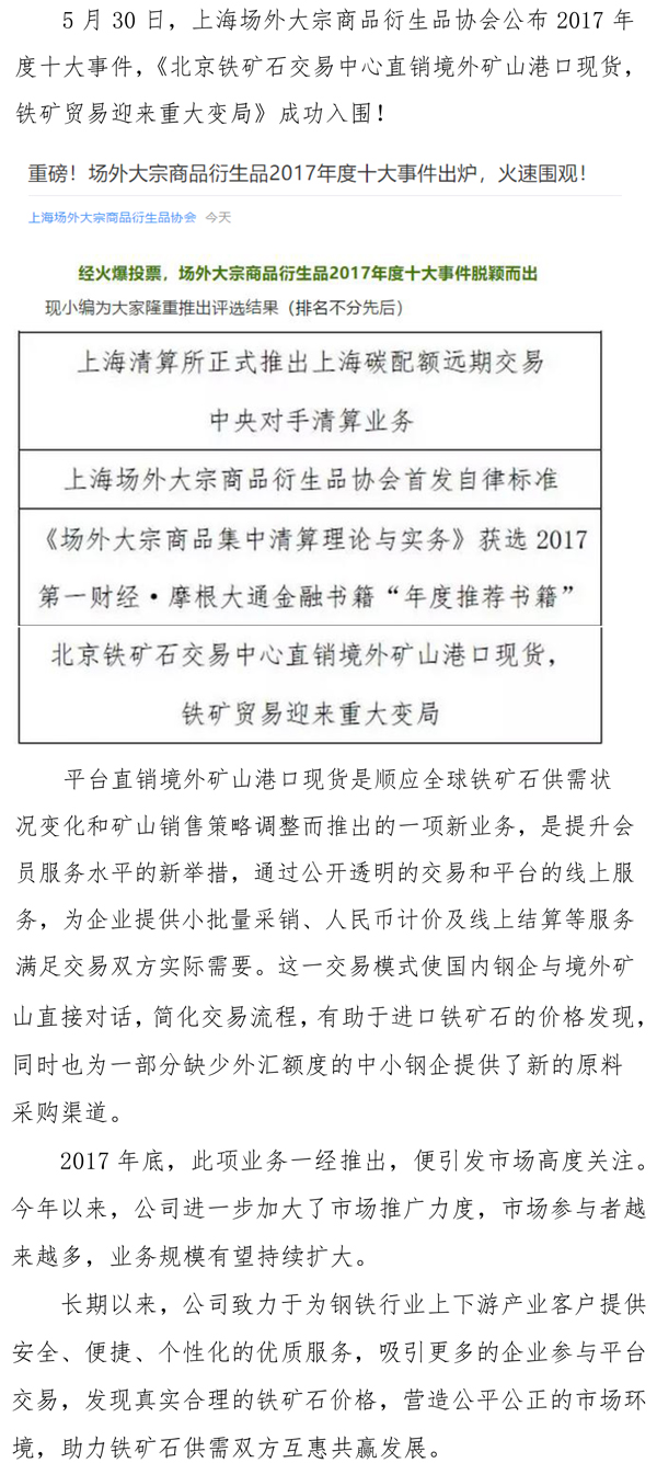 北鐵中心直銷境外礦山港口現(xiàn)貨業(yè)務入圍2017年度十大事件