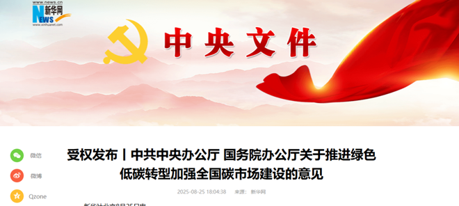 8月25日,新華網(wǎng)發(fā)布《受權(quán)發(fā)布丨中共中央辦公廳 國(guó)務(wù)院辦公廳關(guān)于推進(jìn)綠色低碳轉(zhuǎn)型加強(qiáng)全國(guó)碳市場(chǎng)建設(shè)的意見(jiàn)》。